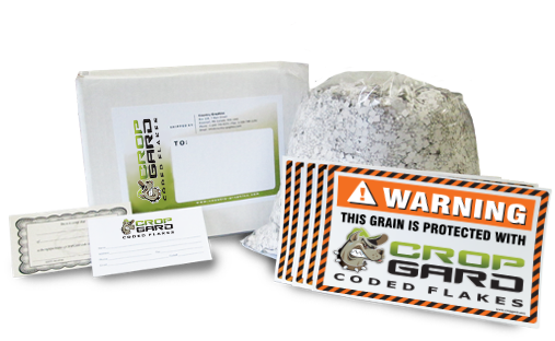 Each box order of Cropgard has an exclusive number and is sufficient to treat 50,000 bu. of grain. Each flake in the grain represents a piece of evidence and proof of ownership. Cropgard can be added to the grain by simply throwing handfuls into the hopper bin on the combine, into the grain auger hopper while the grain is being unloaded into the grainary or at the entry points (top or bottom) of a full bin. Each order also includes 5 warning decals alerting would-be thieves that the grain stored in the storage bin has been treated with Cropgard. What makes Cropgard most effective is the fact that thieves choose not to steal grain with Cropgard in it. If they should decide to take the risk they will be carrying thousands of pieces of evidence with them, wherever they choose to haul it.